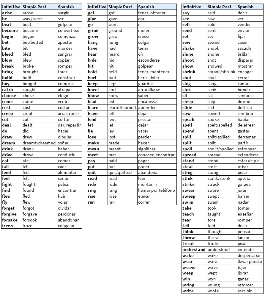 Presentamos aquí una pequeña lista de algunos verbos irregulares con su pasado simple. Intenta recordarlos!